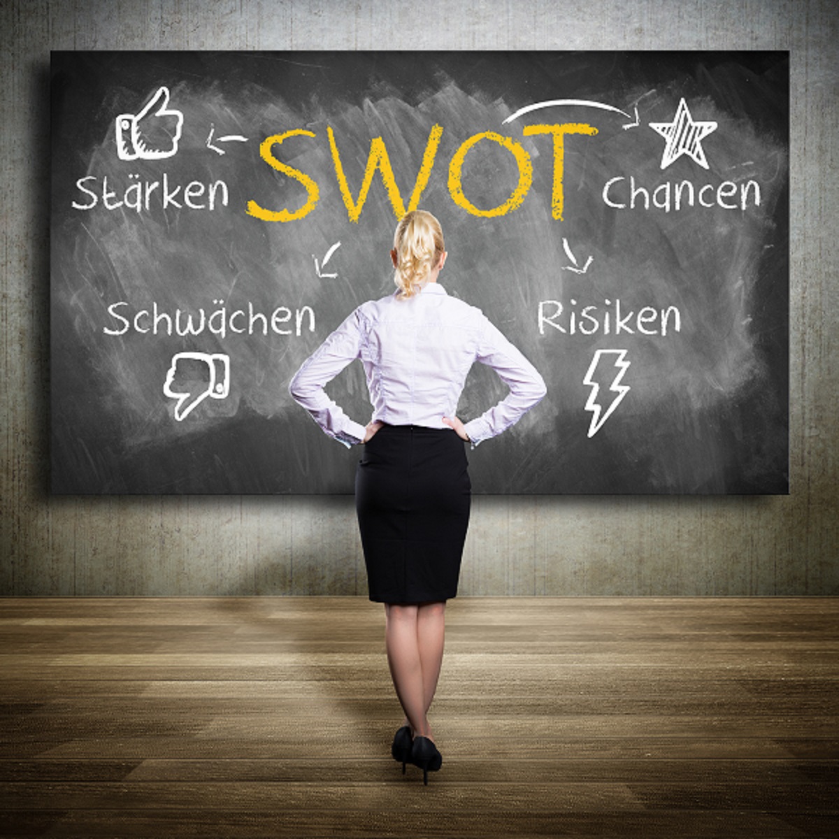 junge Frau mit SWOT-Analyse-Konzept